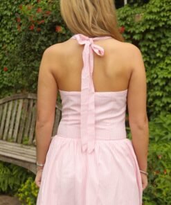 The Coastal Candy Mini Dress features a halter neckline with self tie bow at the back of the neck and an open upper back. The drop waist leads to a flowing skirt and comes in an all over pink and white stripe.