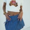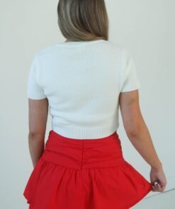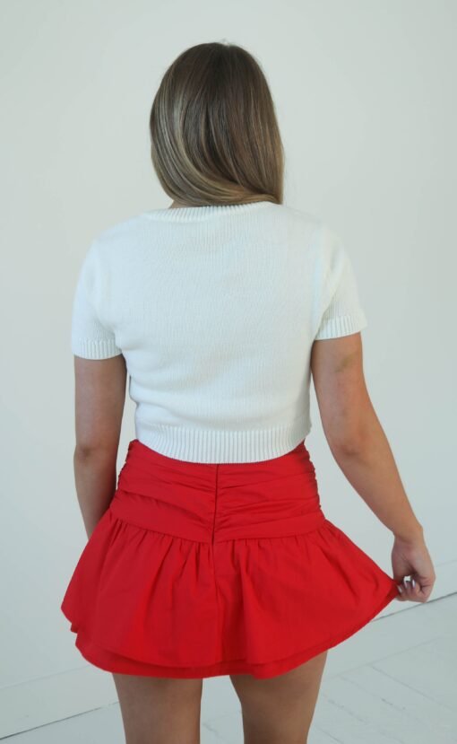 This cherry red mini skirt is a must have for gameday season! It features a drop waist silhouette, ruching and bow details and built in shorts. Style with a gameday tank, cowboy boots and your favorite gameday button.