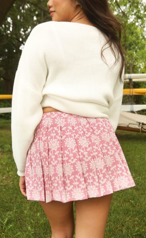 Let freedom ring in this adorable red pleated mini skirt. The Freedom Frills Mini Skirt is a red gingham mini skirt with floral embroidery design all over and an elastic waistband. Style with a graphic tee or simple white tank for a fun patriotic look.