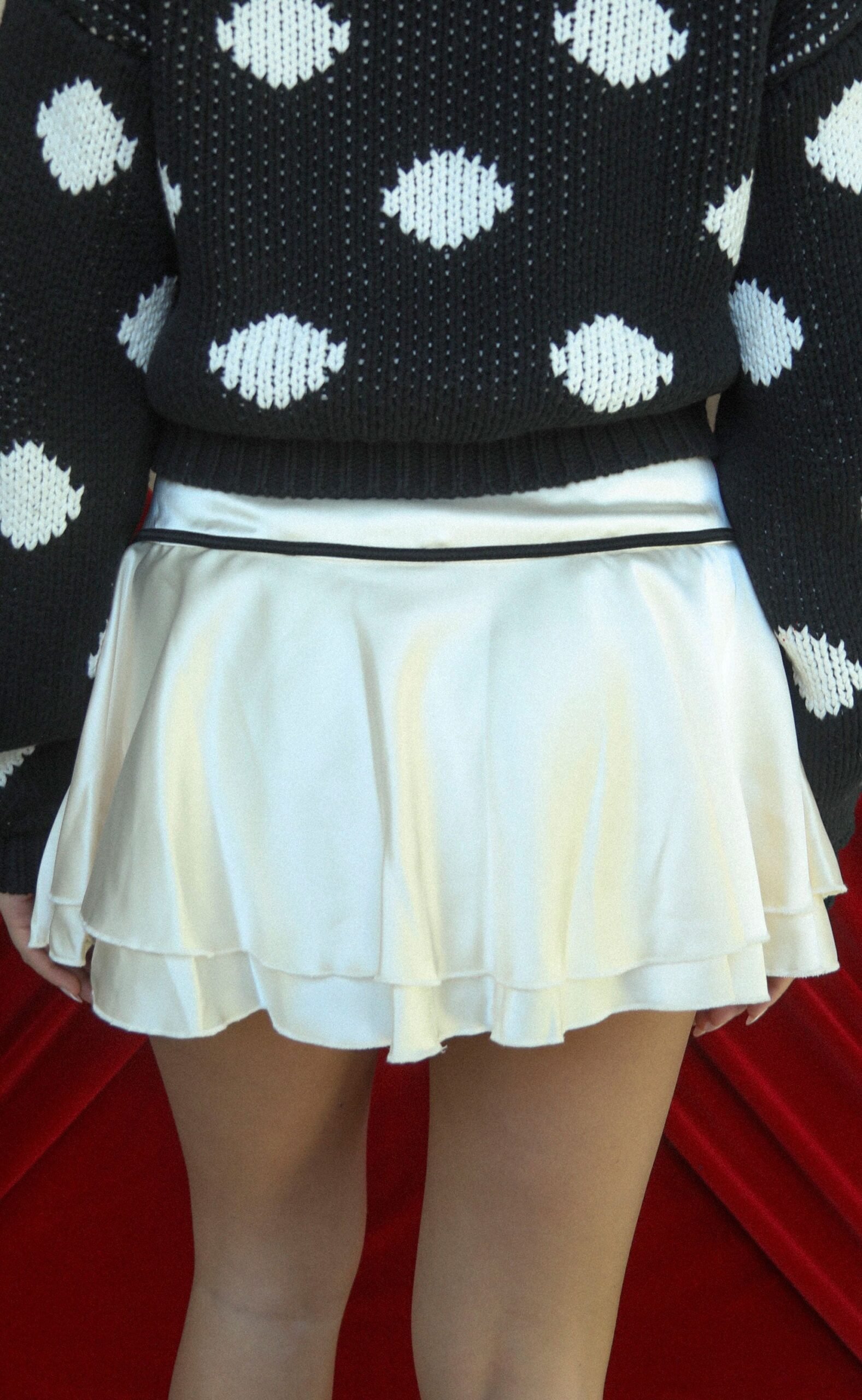 Good riddance to bad fashion! This adorable white silky layered wrap mini skirt features a dainty black bow detail. Style it with a black bodysuit or sweater for a chic, feminine outfit.