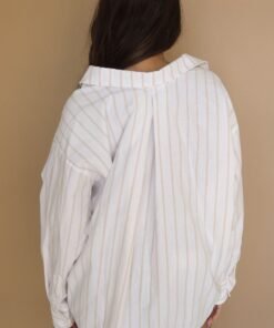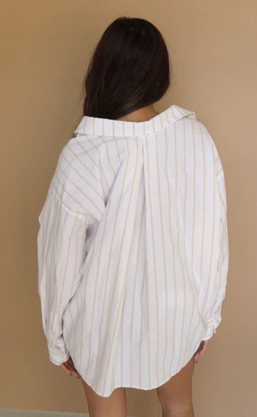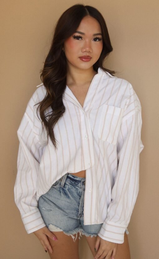 The crisp white button up is a summer must have. The Nautical Lines Shirt is an oversized button up shirt with subtle tan stripes. Size up for a cover up or style with cut offs and sandals.