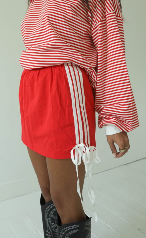 The Too Messy Skirt is a fun red track style skirt with white stripe side details that end in bows – all with build in shorts. Style with a basic tee or tank and chunky sneakers.
